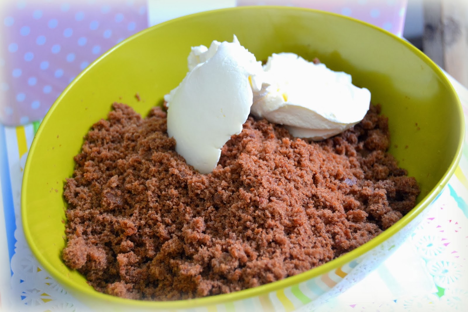 Una vez frío, en un bol desmigamos el bizcocho, ya vereis que fácil!! Añadimos dos cucharadas de queso de untar y mezclamos con las manos. Cuando la masa sea compacta, empezamos a hacer bolitas, que no sean demasiado grandes porque sino se caerán del palito.
